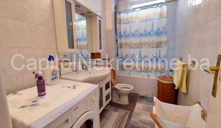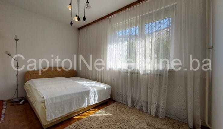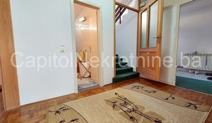 Prodajemo urednu, kvalitetnu dvoetažnu kuću uknjižene površine 136m2 sa uređenom okućnicom ukupne površine 452m2. Kuća je planski građena, tako da se na prizemnoj etaži nalazi garaža za jedan automobil i parking mjesto, te stambeni dio koji se sastoji od prostranog dnevnog boravka odakle je omogućen pristup uređenom dvorištu. spavaće sobe, komforne trpezarije, kuhinje, kupatila i vešeraja. Na drugoj etaži se nalazi tri spavaće sobe kupatilo, toaleta i terase. Kuća posjeduje odvojen ulaz za jos jednu dodatnu garsonjeru. Dvije spavaće sobe imaju izlaz na veliki balkon sa kojeg se pruža prelijep pogled na dvorište, te zelene površine lijepog naselja.
