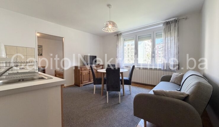 Iznajmljujemo  namješten trosoban stan, površine 53m2, koji se nalazi na provom spratu stambene zgrade u ulici Behdžeta Mutevelića, naselje Grbavica. Stan je uredan, potpuno adaptiran i opremljen  namještajem i kućanskim aparatima. Sastoji se od komfornog dnevnog boravka sa kuhinjom, spavaće sobe, radne sobe, kupatila, manje lođe i predsoblja. Dvostrano je orijentisan i posjeduje velike prozorske otvore što ga čini svijetlim i prozračnim tokom cijelog dana. Stan je u potpunosti opremljen svim elementima potrebnim za ugodan i funkcionalan svakodnevni život. U neposrednoj blizini zgrade nalazi se besplatan javni parking.